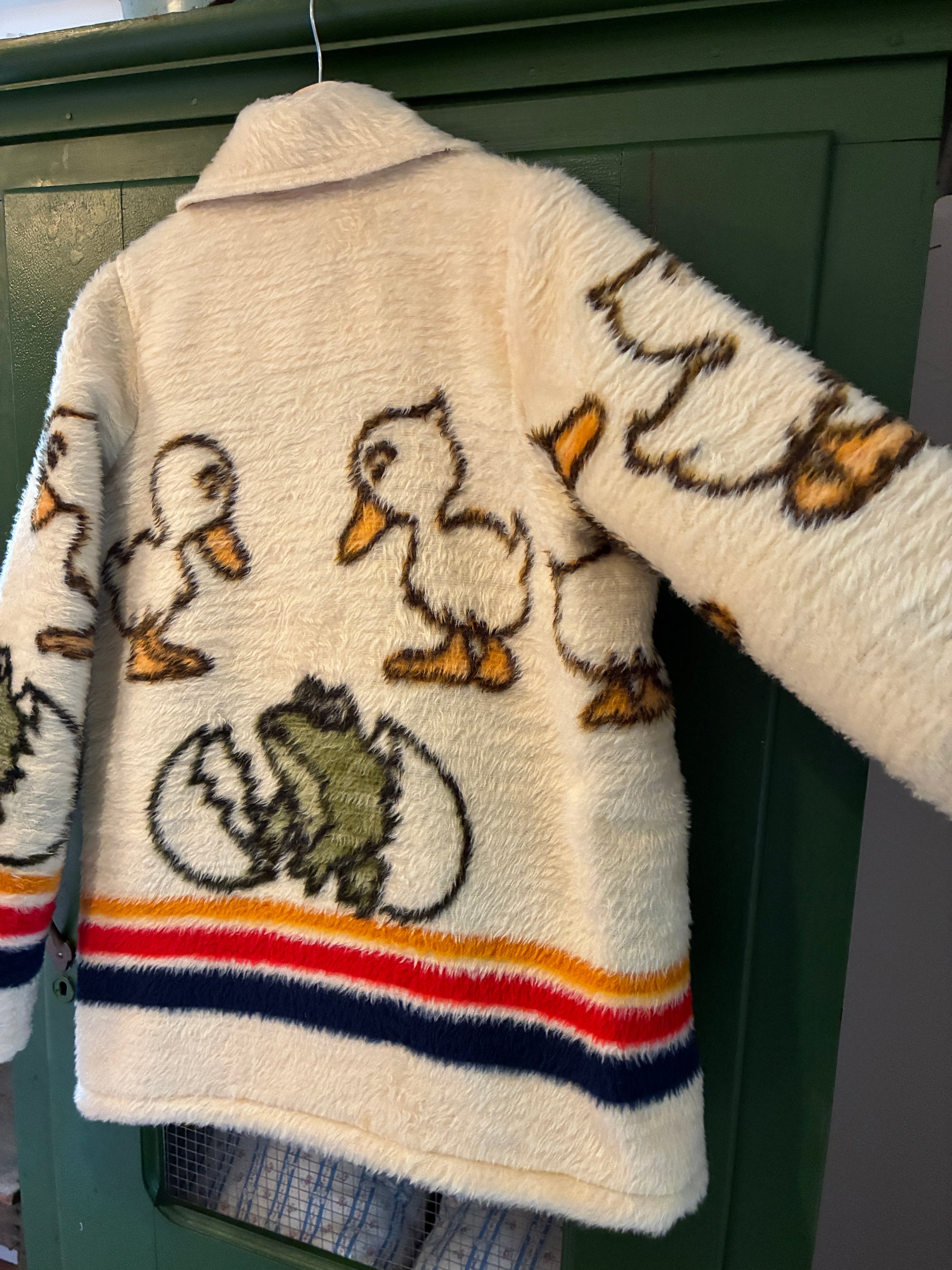 Made from a Vintage Blanket circa 1987. This is our classic Chore Coat Style with two front hand warmer pockets that are lined with the same fabric as the under collar. She has four buttons up the front and a removable shearling collar. Please review all measurements to see if this coat will fit you. This is a medium/heavier weight coat.